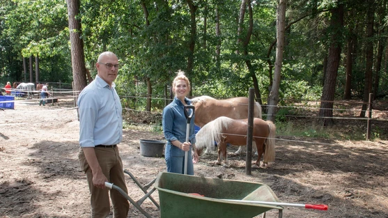 Wethouder Gerrit Boonzaaijer en Directeur Bestuurder van het Sociale dorpsteam Elsbeth Vogel-de Groot hebben bij de lancering van het online vrijwilligers platform ‘Heuvelrug Doet’ beloofd twee keer een uurtje vrijwilligerswerk te gaan doen. Afgelopen week hebben zij zich ingezet bij Manege Lis Hartel